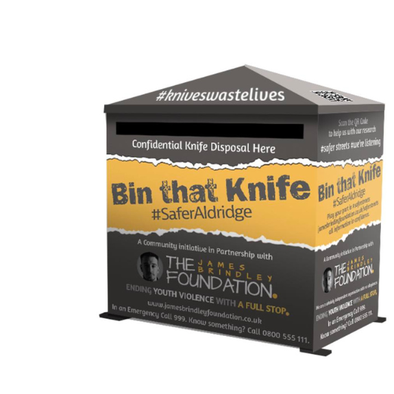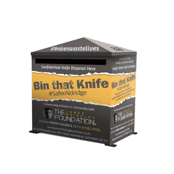 We believe that keeping knives out of pockets and into amnesty bins makes our streets safer. That’s why we’re campaigning to install more knife amnesty bins across the Borough of Walsall and the wider West Midlands. We currently have four amnesty bins across Walsall in the West Midlands and aim to install more in key hotspots identified through our research. Help us increase community safety by supporting the strategic placement of these bins and raising money to help fund it.